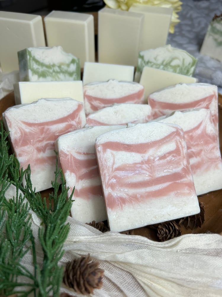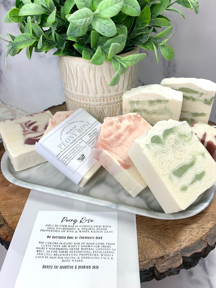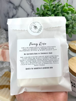 Each Shea Butter Bar — Is Formulated with Skin Nourishing & Mineral Dense Properties of Hydrating & Nourishing Clays. Peony Rose is made with Pink & White Kaolin Clay.