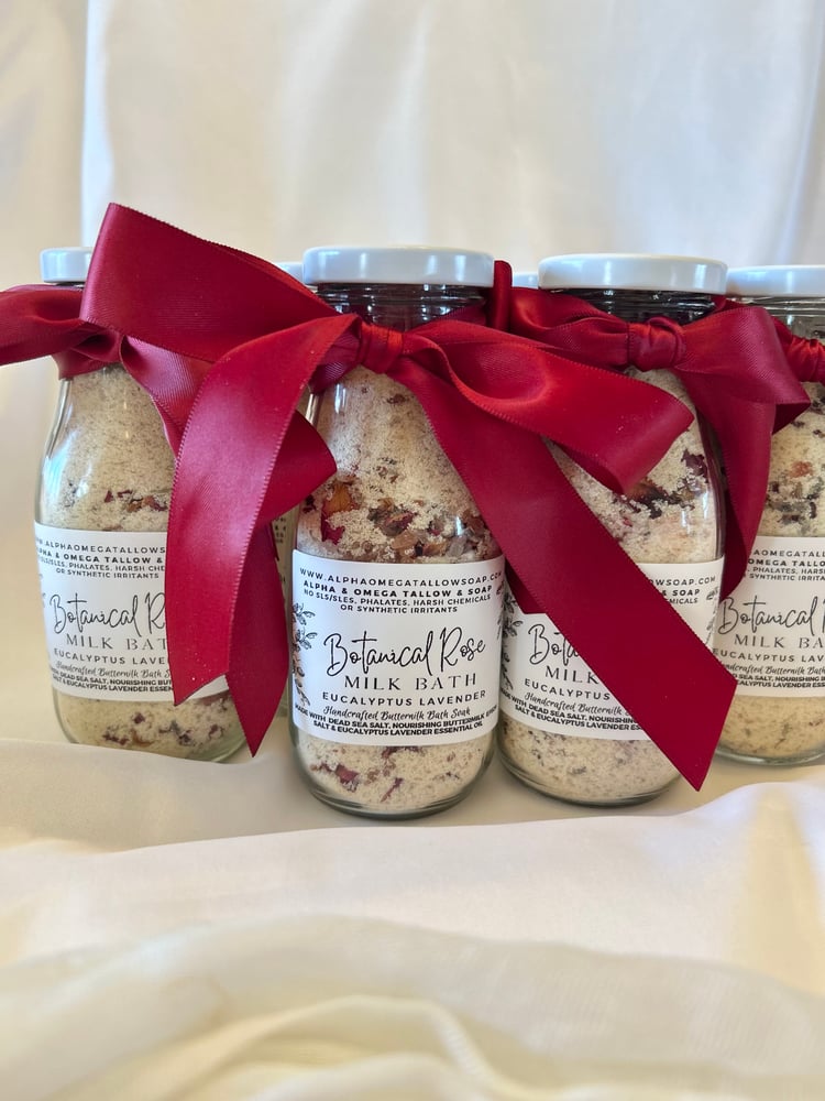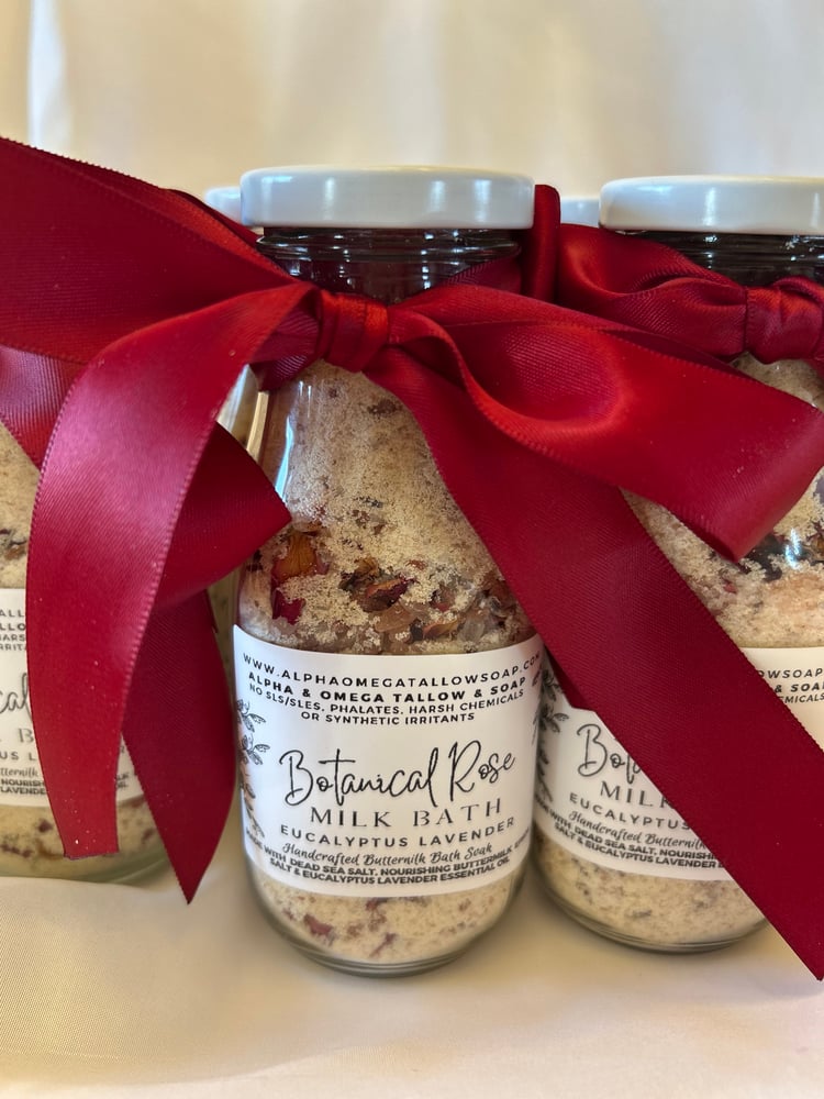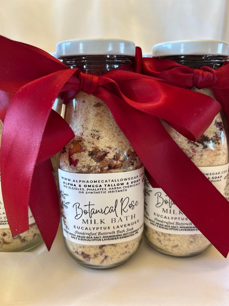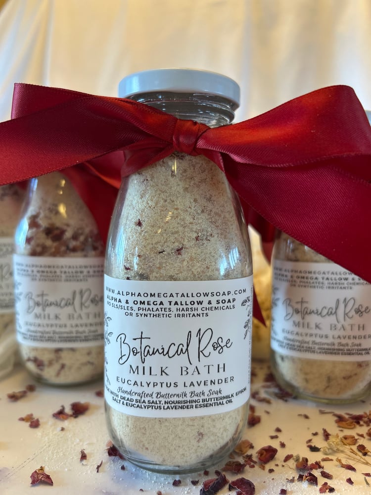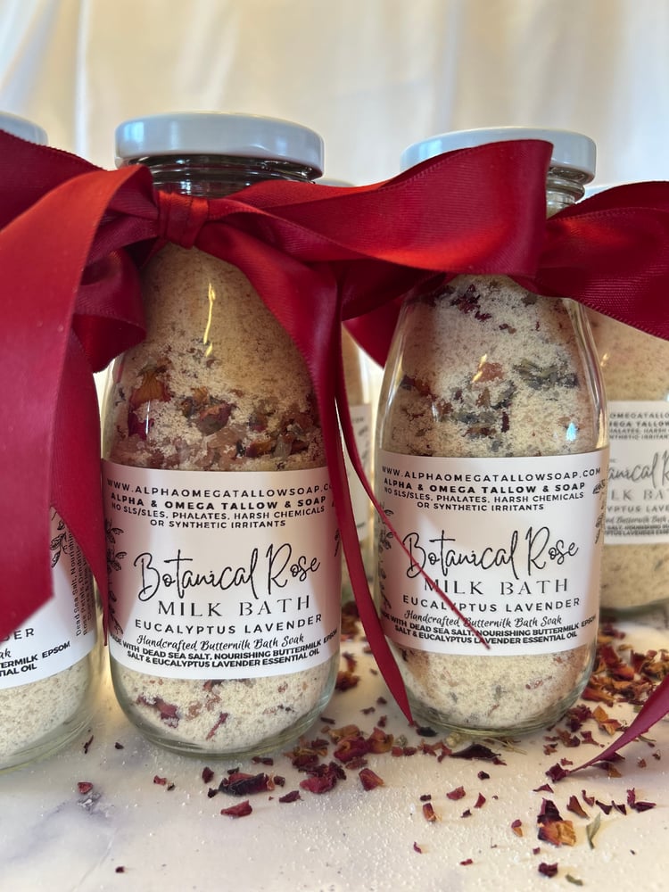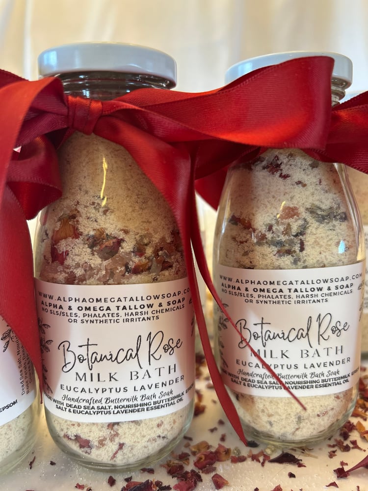 Soothing | Calming | Relaxing Luxury Botanical Milk Bath with Rose Petals, Lavender Buds, Dead Sea Mineral Salt, Pink Himalayan Mineral Salt, Dendritic Salt, Nourishing Butter Milk, Colloidal Oats and Essential Oils — Each luxury milk bath soak is packaged in a beautiful Old Fashioned 10oz Milk Glass Jar.