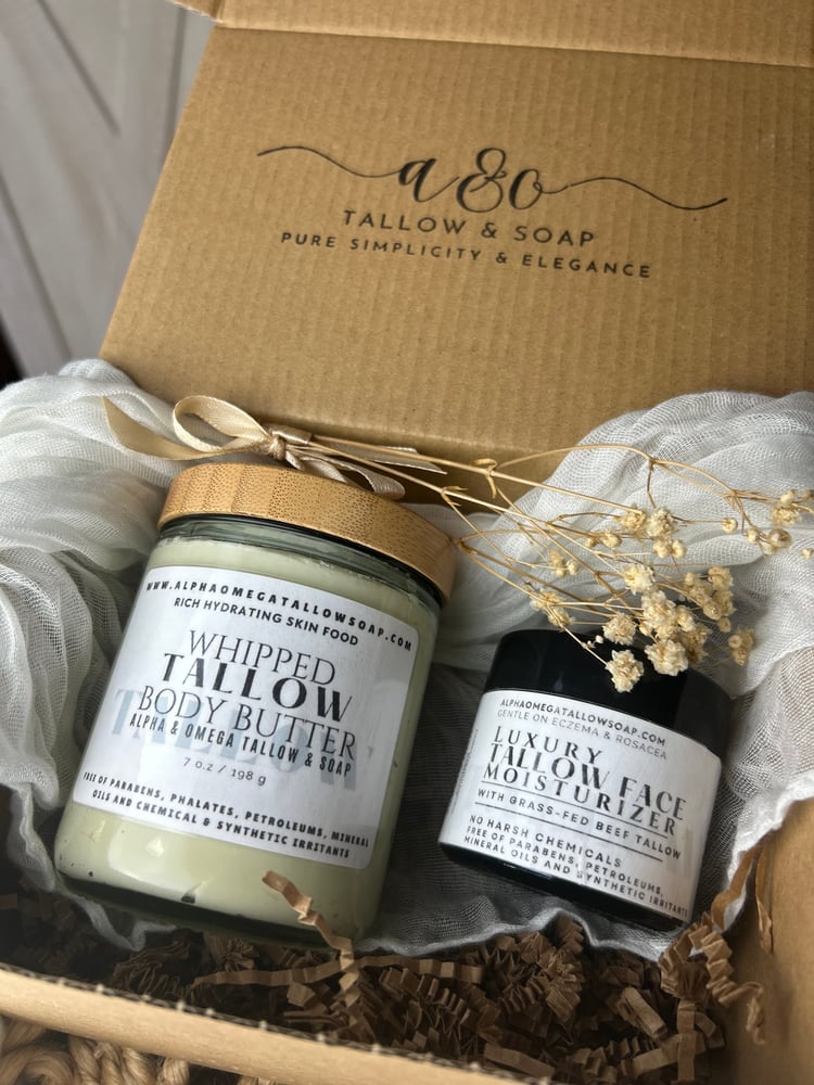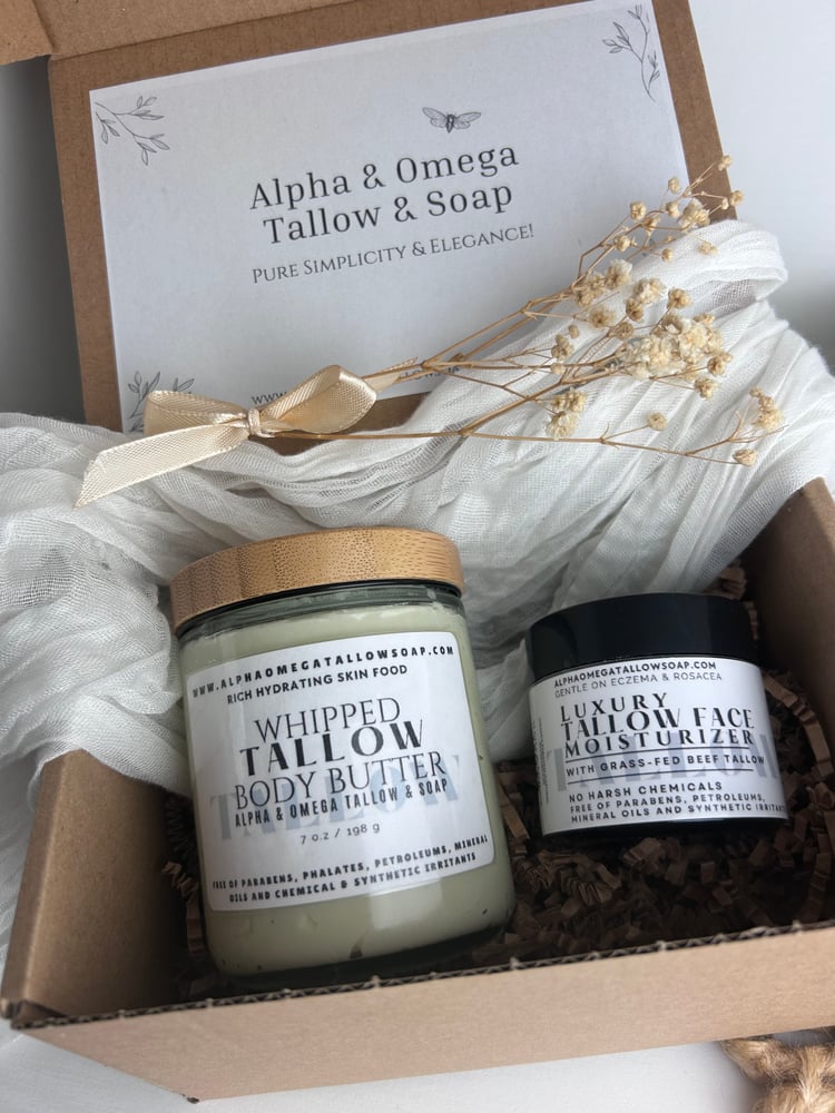This Luxury Tallow Face Moisturizer & Whipped Tallow Body Butter is truly a Luxury in a Jar! Rich in antioxidants and Omega 3, 6 & 9. Deeply Rich in Hydration and Moisture. Designed to moisturize and hydrate all skin types! Gentle on sensitive skin! Great for Eczema & Psoriasis. Tallow is a healthy fat with loads of nutrients, vitamins & fatty acids that bring health, moisture and radiant glowing skin. This Whipped Creamy Tallow Butter is formulated with 100% Grass-Fed Tallow ( grass-fed tallow specifically) it is rich in Omega 6-3-9 fatty acids and includes vitamins A, D, E, K, and B-1.