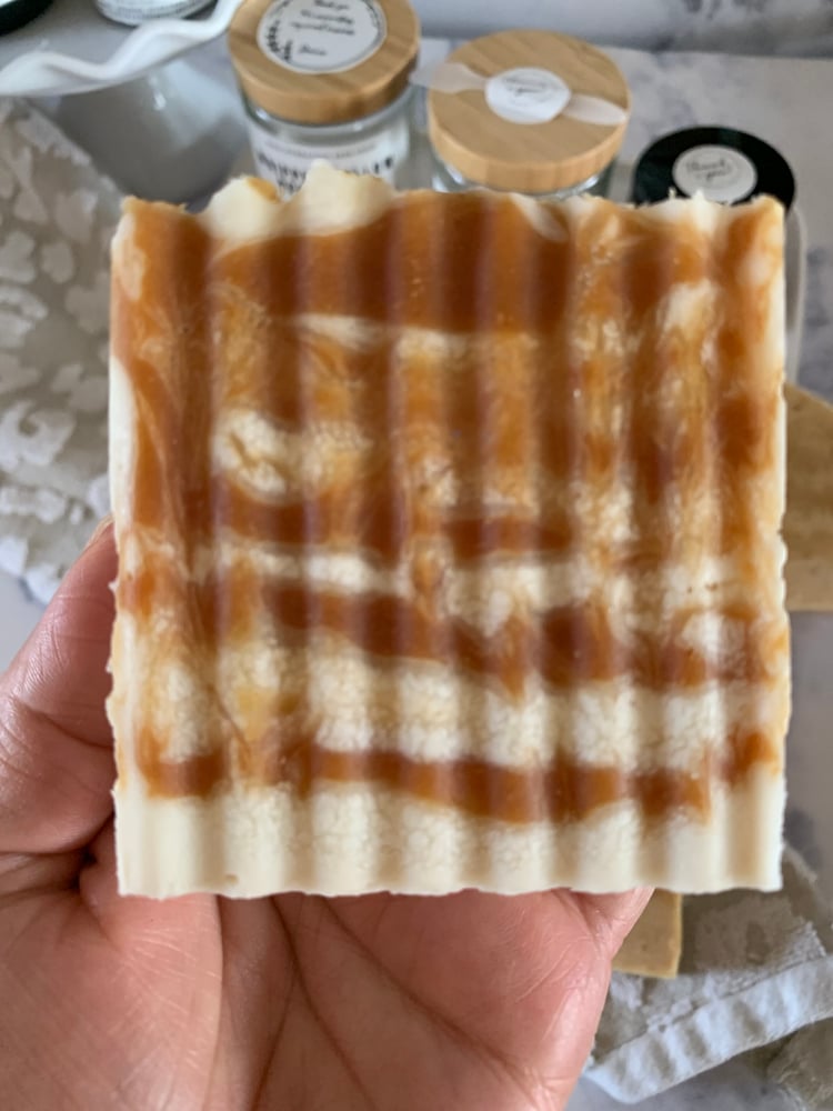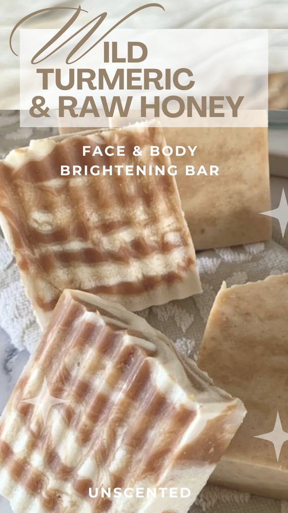 Organic Shea Butter, Organic Coconut oil, Castor oil, Extra Virgin Olive oil, Wild Turmeric, Raw Honey, Spring Water & Sodium Hydroxide. *Fragrance Oil optional if scented